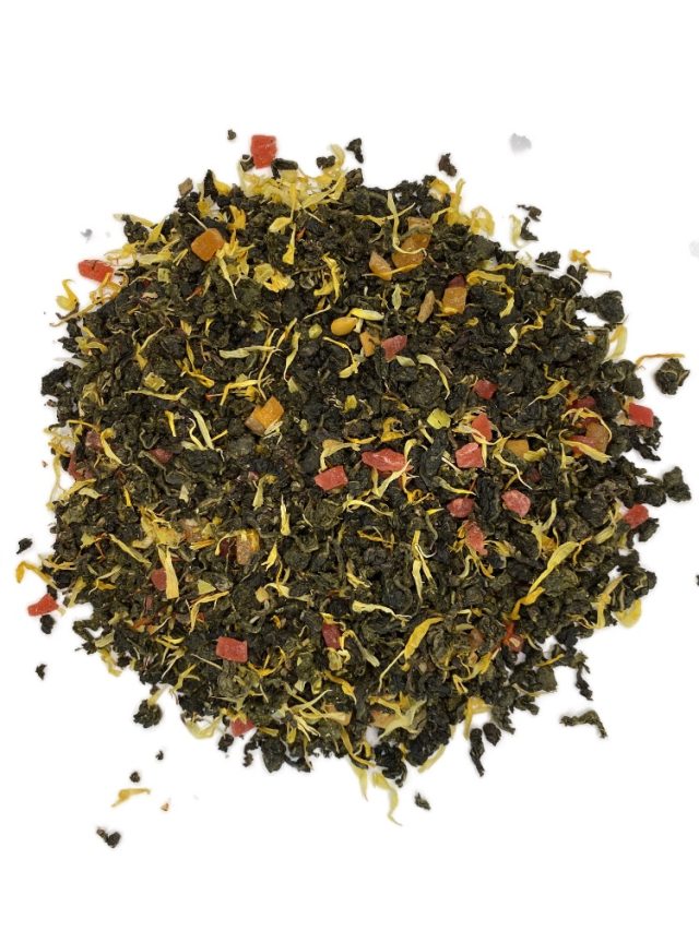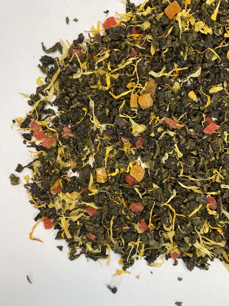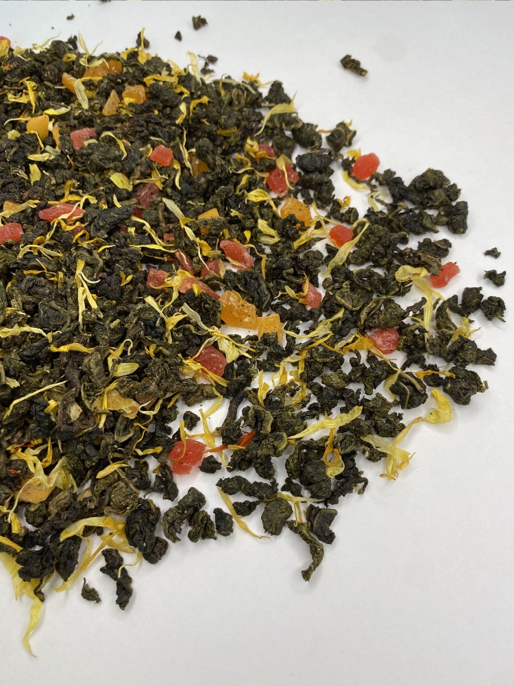 Это высокогорный китайский чай Те Гуаньинь, в основу которого входит манго натуральное резаное, лепестки сафлора, карамелизированный сахар.