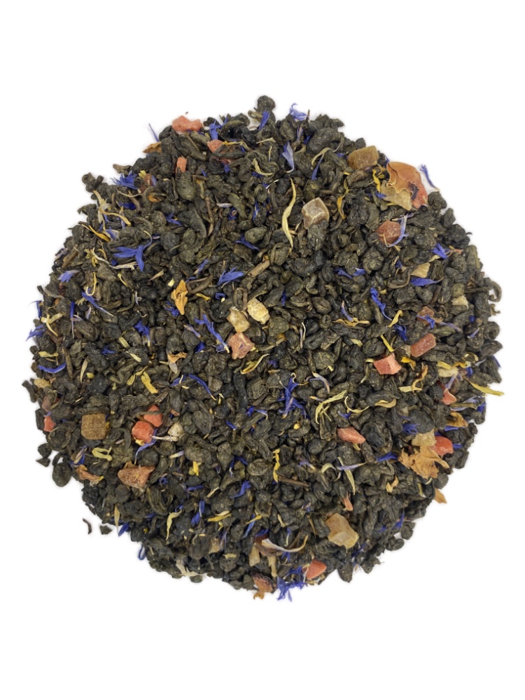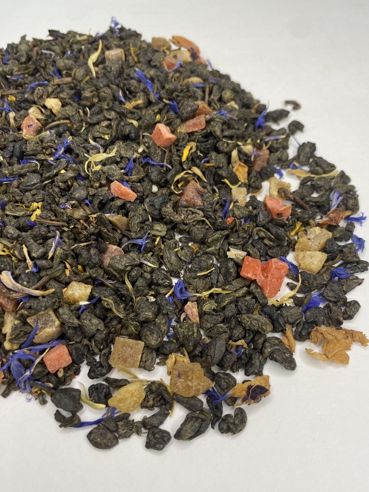 Это зеленый чай Ганпаудер с летним ароматом тропических фруктов манго и маракуйя, с лепестками розы, календулы, василька и с кусочками тропических фруктов.