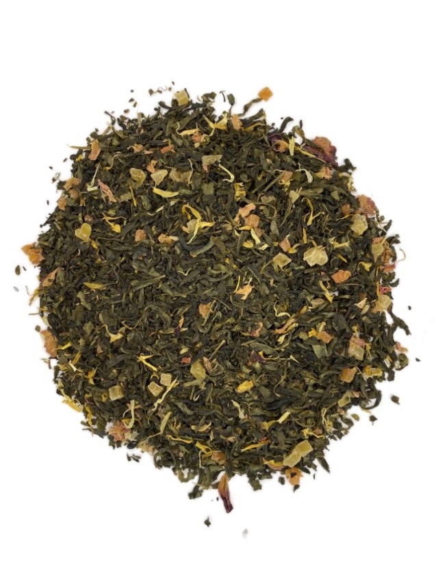 …В основе напитка – китайская разновидность чая сенча. После сбора его обрабатывают паром, чтобы предотвратить окисление. Затем листья чая скручивают, оставляют высыхать, смешав с кусочками манго, ананаса, лепестками роз, календулы.